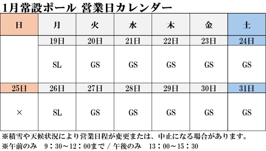 【2025-26シーズン】常設ポール営業開始!! 2026.01.18 お待たせしました!1/19〜常設ポール営業を開始いたします! 今シーズン、スラロームの日程を1日追加しました!(日曜日、月曜日) 昨年までスラロームが出来なかった方もこの機会にぜひご利用ください! 前の記事へ 記事一覧 次の記事へ